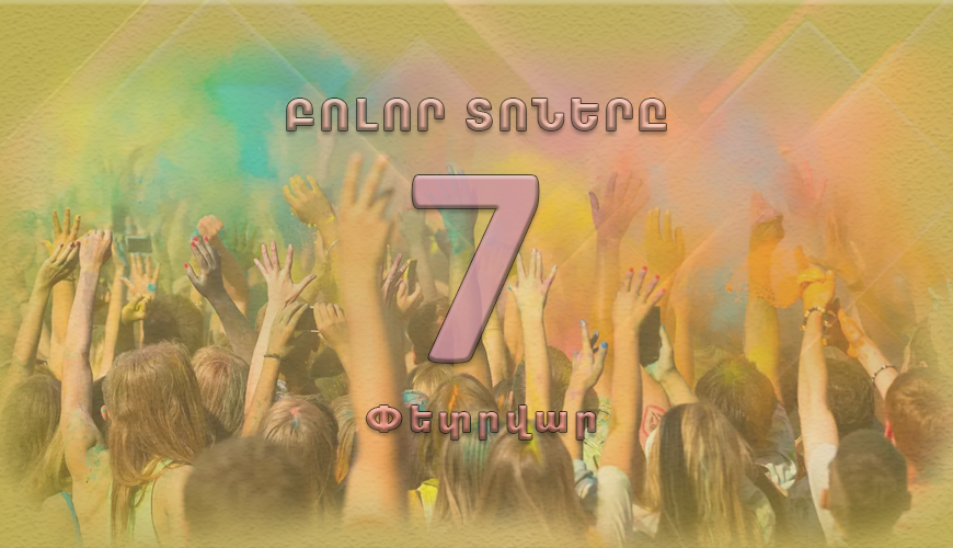 Փետրվարի 7-ը Մաստակի, Մերկ աշխատելու, Կարմիր հագուստի, Վարդերի, Բալետի, Երեխաներին ժպիտ նվիրելու, Հարևանին ձեռքով անելու, Ընկերներին բացիկներ ուղարկելու, Սուրբ Մելի, Համացանցում հայատառ գրելու, Լուսին թռչելո...