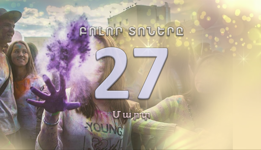 Մարտի 27-ը Երկրի Ժամը, Թատրոնի միջազգային, Բժշկական գիտությունների կապի, Վիսկիի, Քվենտին Տարանտինոյի ծննդյան, Վիագրայի, Քանթրի երաժշտությամբ տարօրինակ երգերի, Կարակուլների, Ֆրանսախոս մշակութային համայնքի, Սակուրայի ծաղկման, Թռչ...
