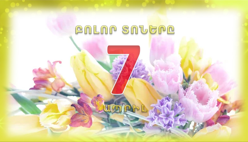 Ապրիլի 7-ը կուղբի, ուշացած թերթի, ռեգբիի, մետրային համակարգի, թույլ գարեջրի, մայրություն և գեղեցկություն, կոսմետոլոգի, սխրագործության, սրճային տորթի, առաջին քայլի, տնային գործերից խուսափելու օրն է: