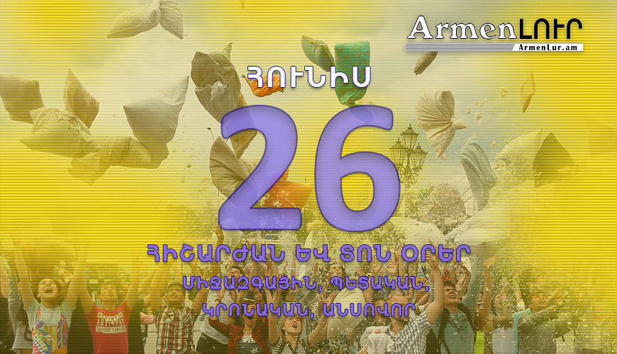 Հունիսի 26-ը Սառեցնող սարքավորումների, Վարդագույն գինու, Ատամի խոզանակի, Սպիրիտիզմի, Գեղարարի , Շոկոլադե պուդինգի, Ներողամտության, Շան հետ աշխատանքի գնալու, Սերուցքով թեյի, Կոկոսի, Առնետաորսորդի, Պատերի ստվերների օրն է։