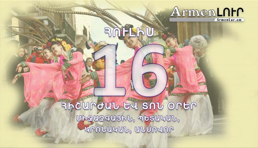 Հուլիսի 16-ին Օձերի, Ծովախոզուկների, Հաճախորդների հետ ծանոթանալու, Եգիպտացորենով ալադիի, Թարմ սպանախի, Անձնական խոհարարի, Ասֆալտին նկարելու, Համով կերակրի, Հոգևոր սիրո, Դդումի օրն է։