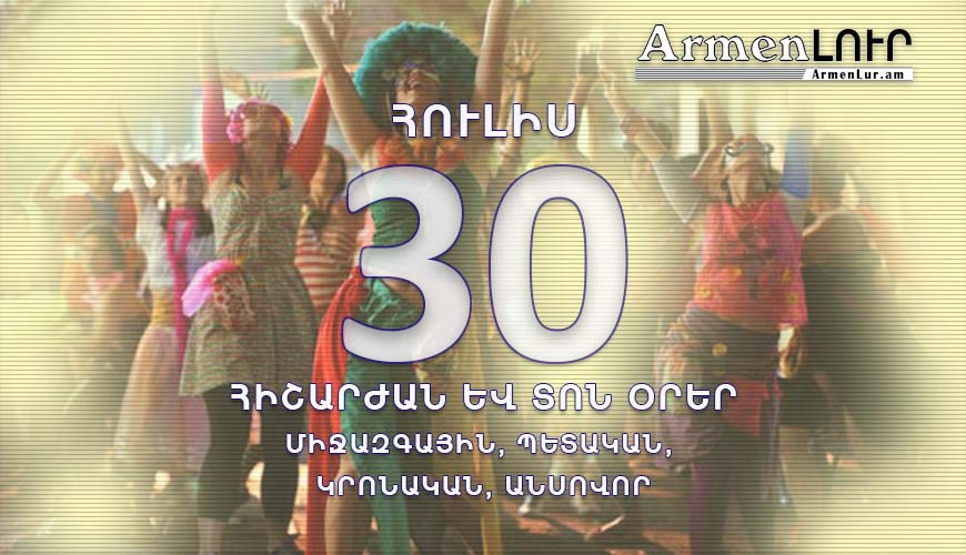 Հուլիսի 30-ը Ընկերության, Ասեղնագործության, Ցանցային ադմինիստրատորի, Սկեսրայրի և սկսեսրոջ, Աստծուն ապավինելու, Չիզքեյքի, Փափուկ կազմով գրքերի, Երազանքի թատրոնի, Գրկախառնության, Գունավոր խմիչքների օրն է։