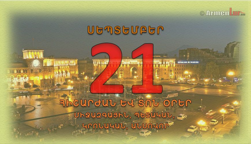 Սեպտեմբերի 21-ը Խաղաղության, Սլինգով երեխա կրելու, Երախտագիտության, Առանց թափոնների, Բանանի, Պեկան ընկույզով թխվածքի, Բեթմենի, Թեյի, Մինի գոլֆի, Ուսանողի, սիրո, գարնան և երիտասարդության, Արևածաղկի, Հեքիաթներ որոնելու, Գարնան օրն է։