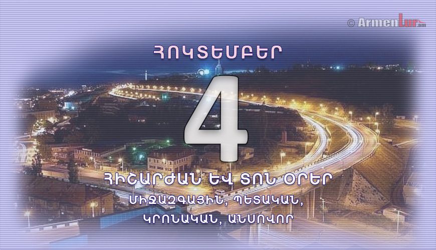 Հոկտեմբերի 4-ը Կենդանիների, Տիեզերքի, Ինքնացուցադրման, Շշի միջի նավի, Չտրված հարցերին պատասխանելու, Սերունդների, Գոլֆի սիրահարների, Օղու, Տասից չորսի, Լամպերի փոխման, Դարչինով թխվածքաբլիթների, Խրթխրթան տակոյի, Գրասենյակի բարելավման, Տարօրինակ գուլ...